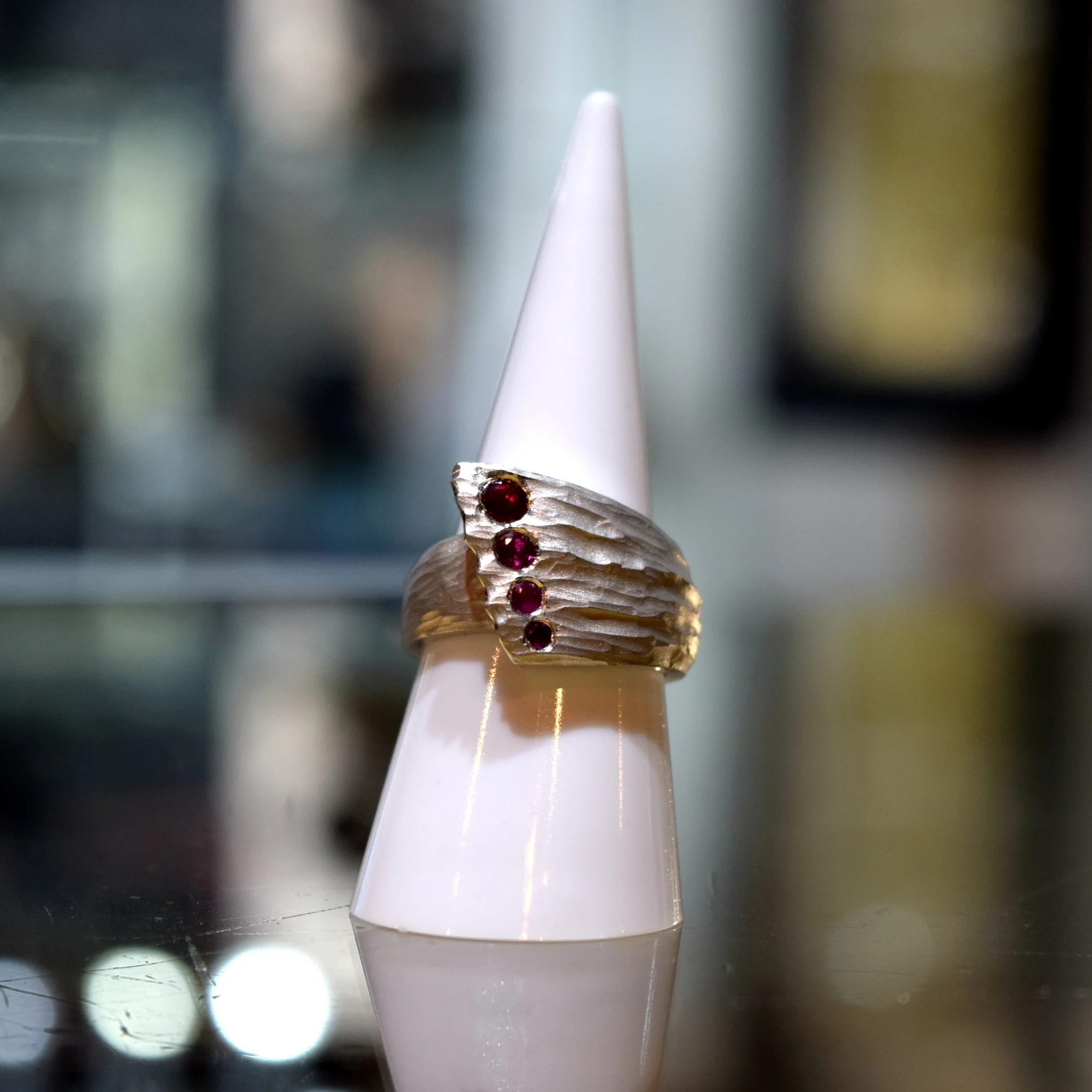 The colour of rubies can be slightly uneven, and it’s normal for them to have minor inclusions such as minerals, growth structures, canals and cavities. Discoid fractures around natural mineral inclusions often occur and are a sign of heat treatment.