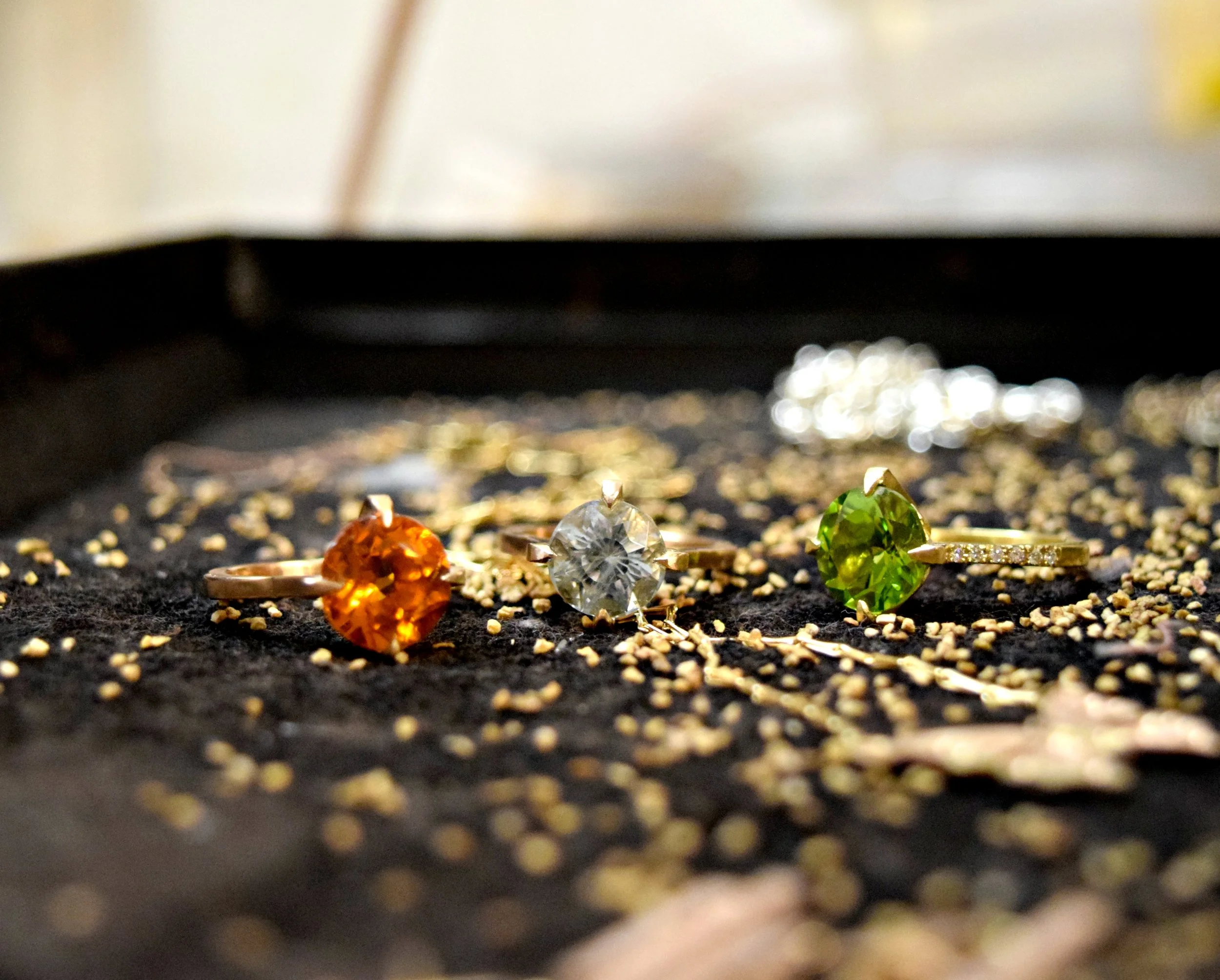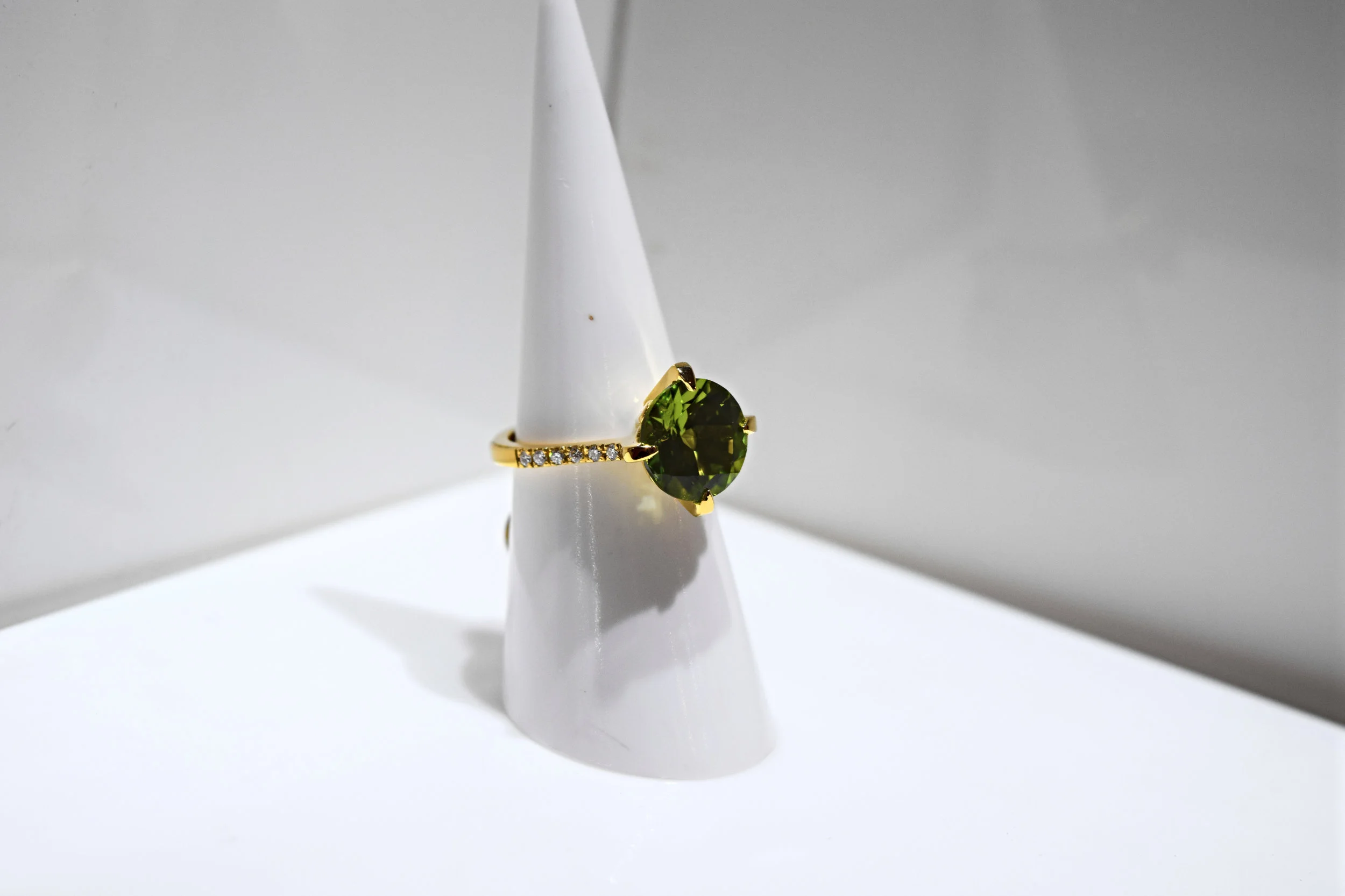 Peridot is known as the gem-quality variety of olivine. It's an idiochromatic gemstone, which means that the colour comes from the chemical composition of the stone itself, and not from impurities. Therefore peridot can only ever be found in green, but may vary between a pale yellowish green, olive green, bottle green, or an intense vibrant apple green, the latter being the most desirable.